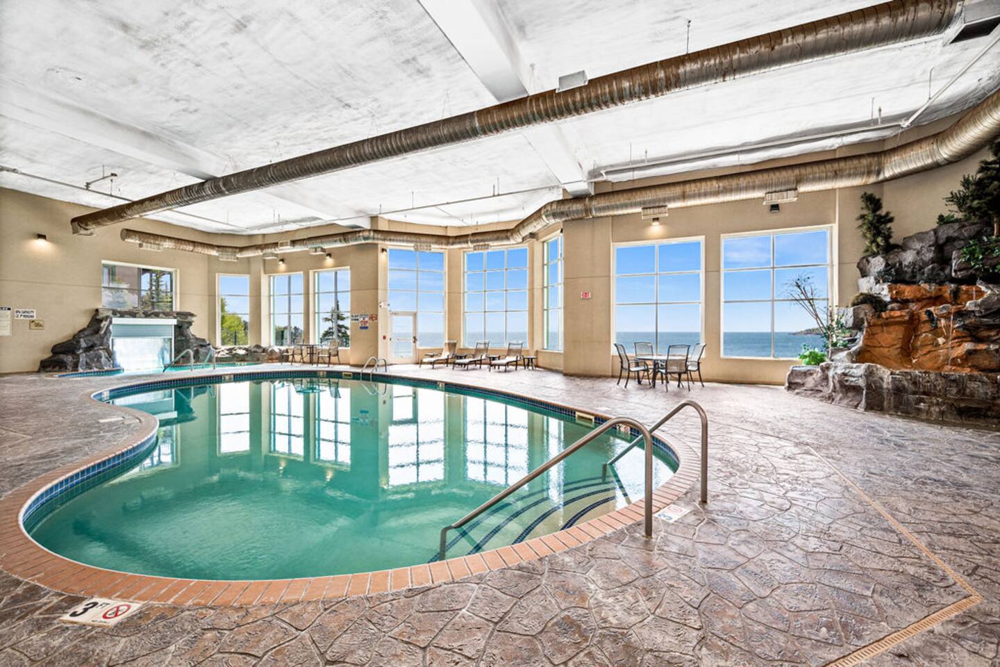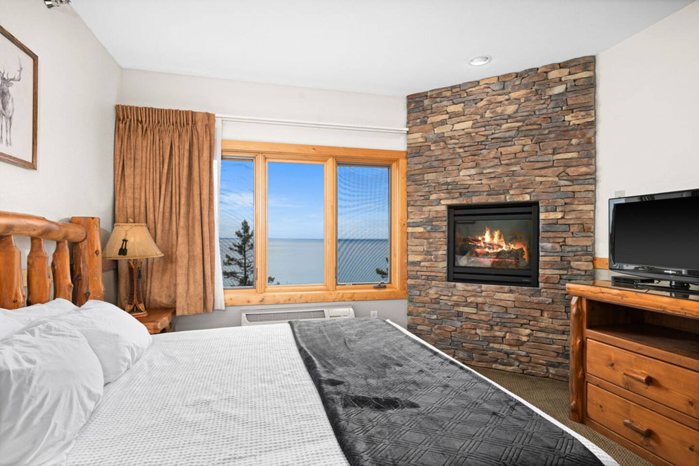 Retreat to the tranquility of Minnesota's breathtaking North Shore. Located in the charming town of Two Harbors, this lakefront king bedroom is situated in a private bay. The room features expansive windows showcasing stunning views of Lake Superior. Amenities include an indoor pool, indoor/outdoor hot tub, fitness area, sauna, and beachfront bonfire. Come unwind in the serenity of nature!