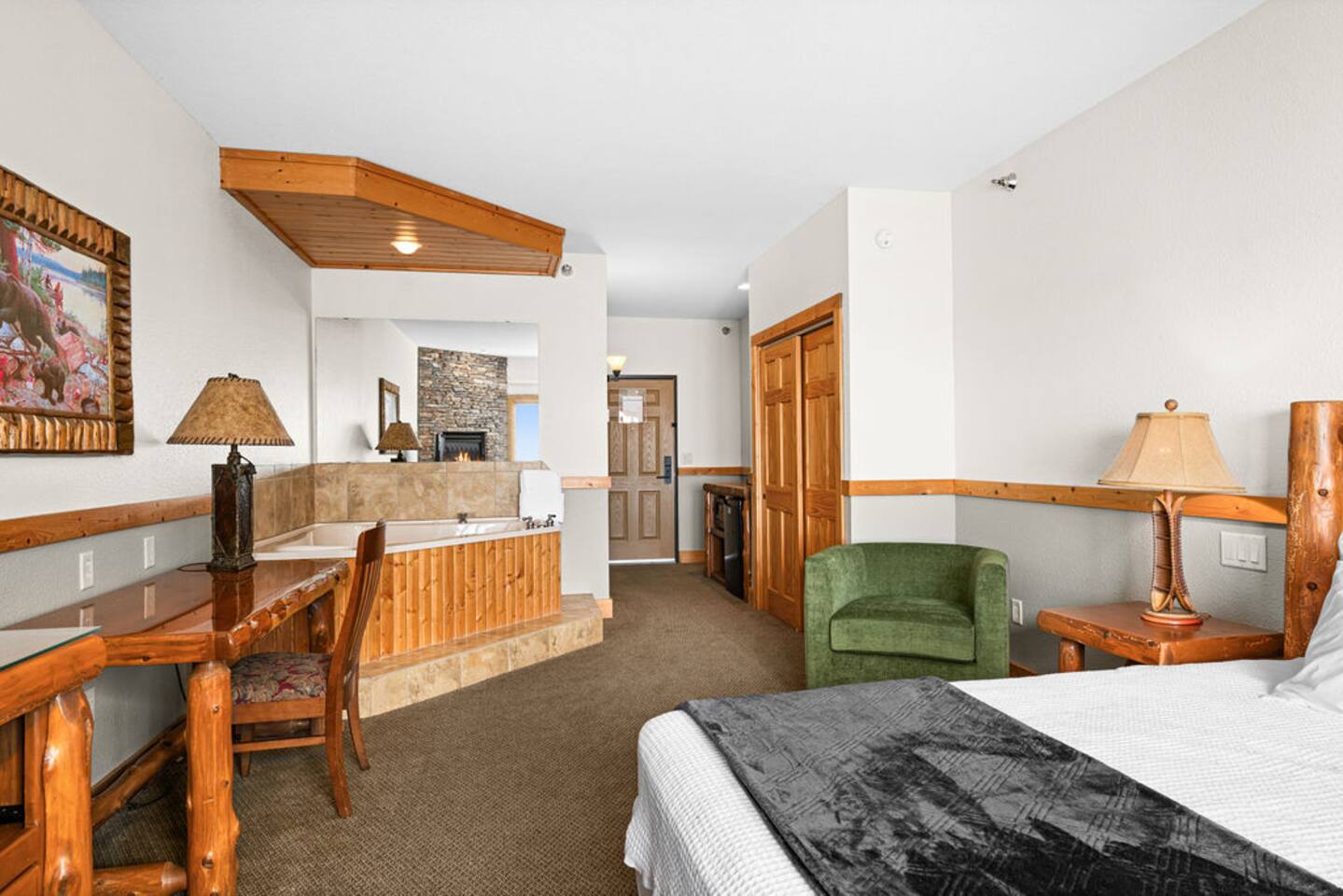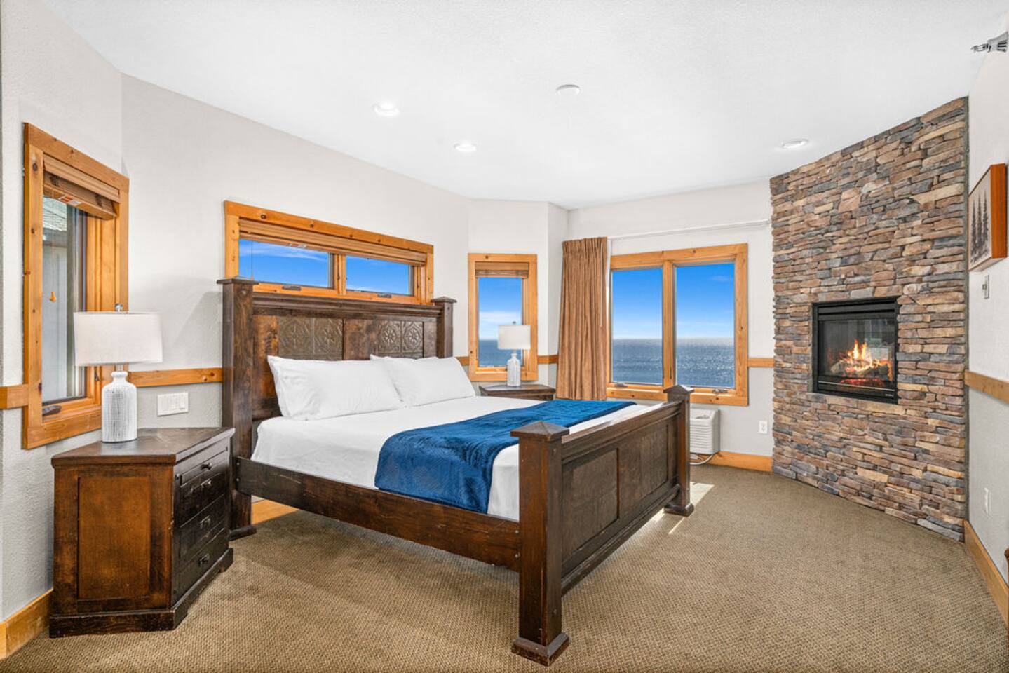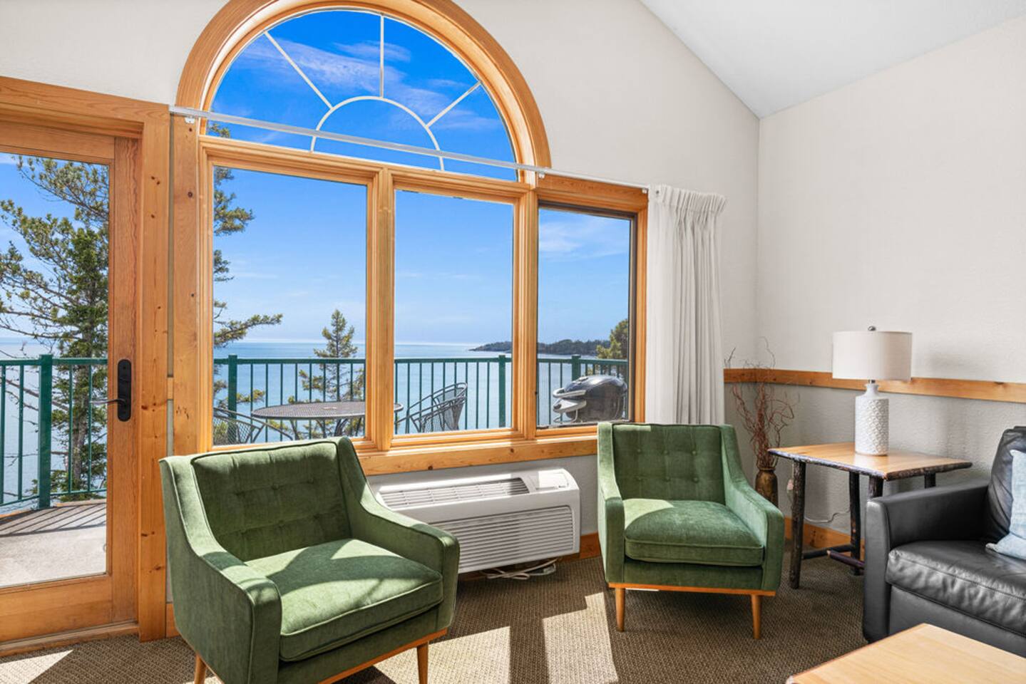Entryway: hallway door opens to an entryway with doors leading to three separate lock-off units for maximal privacy including a primary bedroom suite, an adjoining king room, and a delightfully appointed queen over queen bunk bed room. Primary suite bedroom: spacious retreat with lake views, a king-sized bed, ensuite bathroom, fireplace, and whirlpool spa. Connects to fully equipped kitchen, dining area, and living room with a fireplace and private balcony. Adjoining king room: generous space with lake views, dedicated workspace perfect for digital nomads, ensuite bathroom, fireplace, and whirlpool spa. Has a mini-fridge and an in-room Nespresso coffee maker. Queen bunk bed room: queen over queen bunk bed, arcade table, ensuite bathroom, mini-fridge and an in-room Nespresso coffee maker. Additional sleeping: top-of-the-line Room&Board king-size American Leather sleeper sofa with bedding provided for maximum comfort during your stay. Living room: professionally decorated with ample seating, fireplace, TV, puzzles/books/games, balcony with unparalleled lake views, outdoor dining, and an electric grill. Kitchen: fully equipped kitchen with oven, stove, refrigerator, dishwasher, microwave, dishware, flatware, toaster, wine glasses, Nespresso machine as well as drip coffee maker. Amenities: community indoor pool, indoor/outdoor hot tub with lake views, sauna, fitness center, coin laundry, ice machine, beach bonfire, playground, and beach access. Community parking lot with 220v EV charger available w/fee. Our guests are welcome to use the nearby Superior Shores resort's outdoor pool for a fee. Contact the resort for more information. The condo is one level with accessible parking and zero step entry. Enjoy free high-speed Wi-Fi, towels/linens, iron, hair dryer, complimentary toiletries, dish soap, dishwasher detergent, trash bags, and paper towels. The corner penthouse is one of the most desirable units in the Burlington Bay complex because of its higher ceilings, larger windows, and no sounds of footfalls overhead allowing for maximal relaxation during your stay. The seaport town of Two Harbors is the gateway to Minnesota’s North Shore. With breathtaking views of North America’s largest great lake, this ideal destination offers endless activities for outdoor enthusiasts with access to hiking, biking, and kayaking in the summer and skiing, skating, and snowmobiling in the winter. The penthouse sits directly on the beginning of the Gitchi-Gami State Trail. When complete, this 86-mile paved trail will run along the North Shore of Lake Superior, connecting Two Harbors to Grand Marais and offering access to multiple historic sites and five majestic state parks.